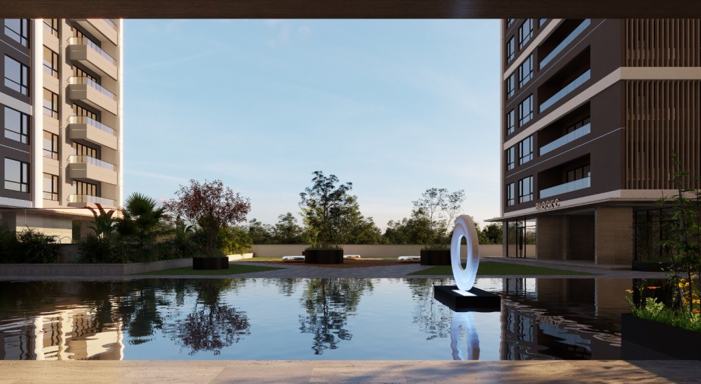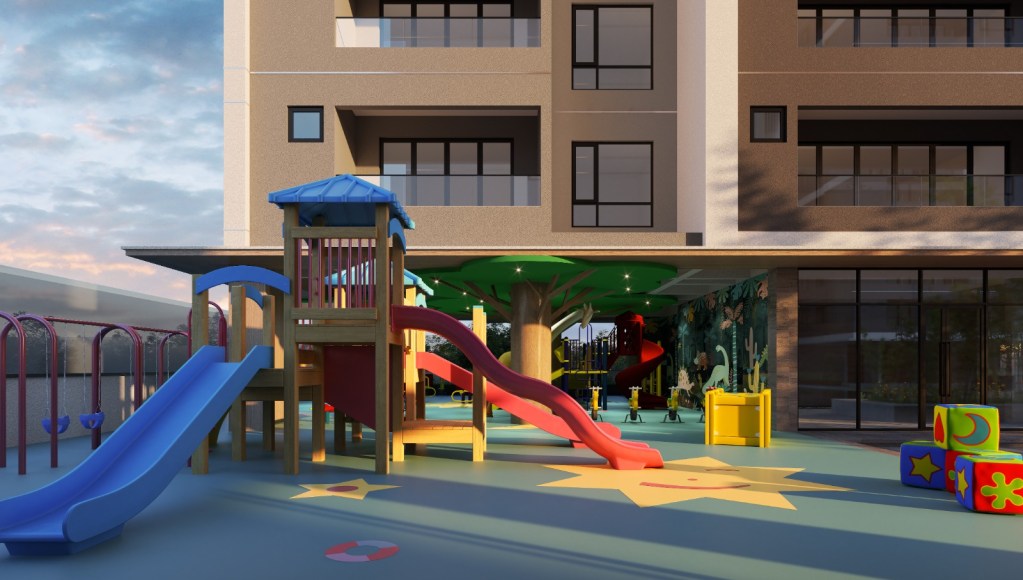 A 1,500-square-meter area with water features, BBQ spaces, and a secure children’s play area.